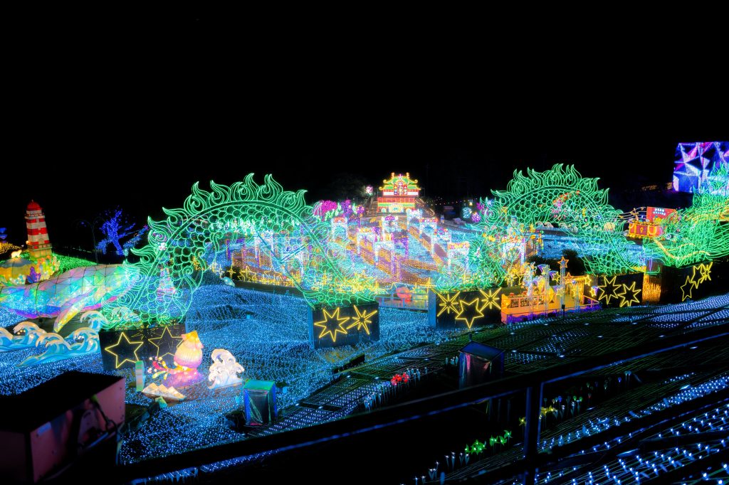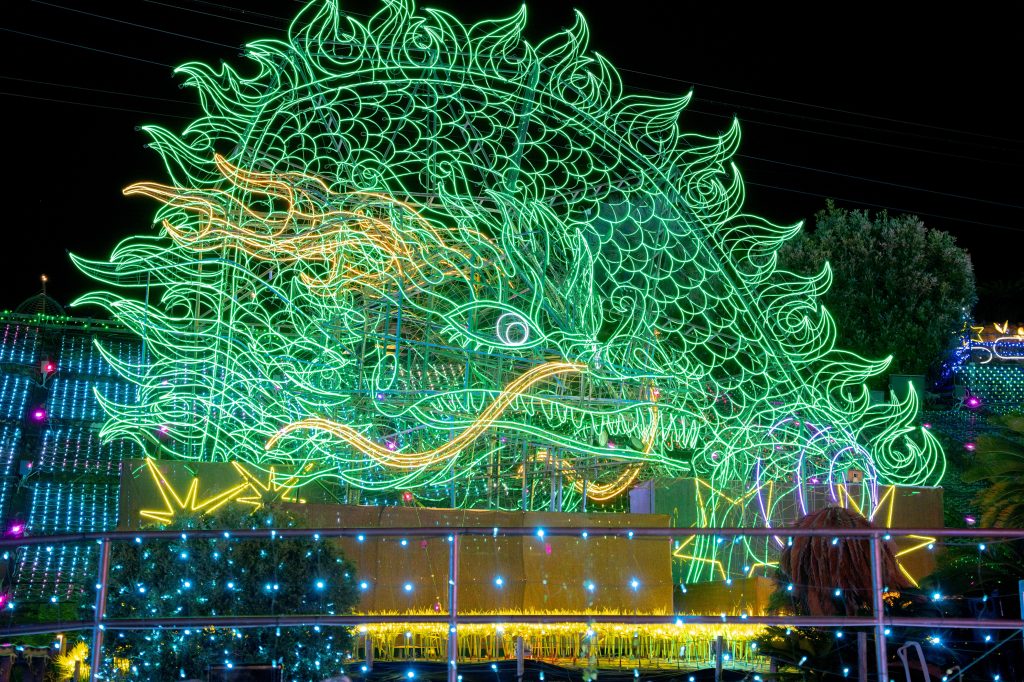 龍の頭は高さ約10m、全長100mほどの大きさを誇る。さらに、龍の後ろには横160m、高さ30mの巨大なイルミネーションパネルが彩ります。