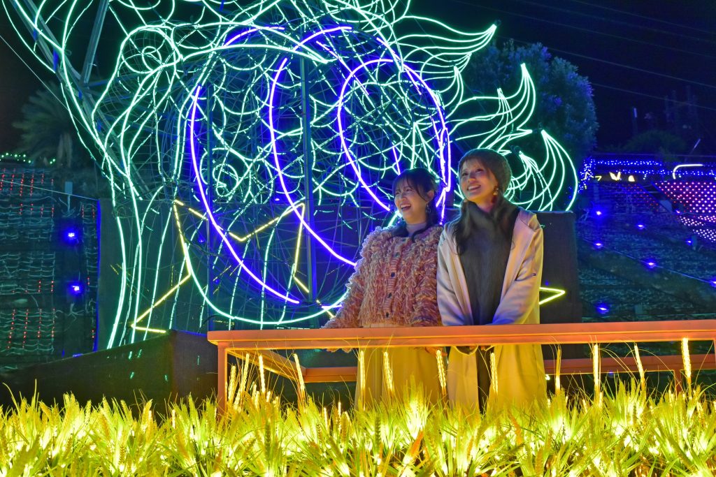 龍の頭は高さ約10m、全長100mほどの大きさを誇る。さらに、龍の後ろには横160m、高さ30mの巨大なイルミネーションパネルが彩る。