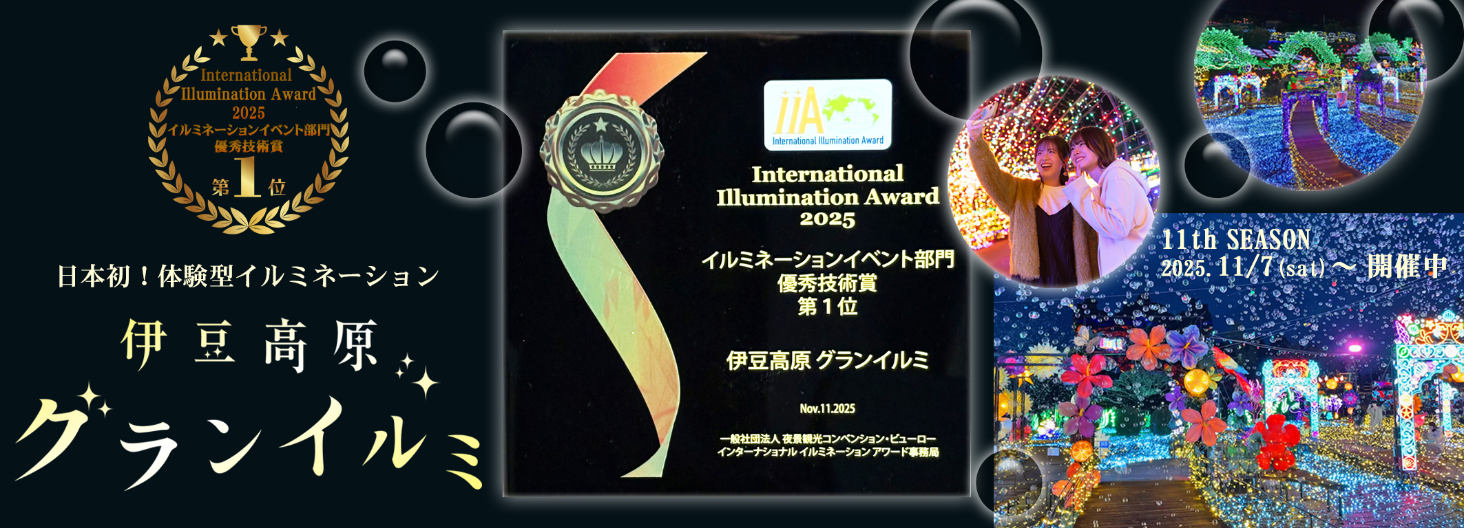 伊豆ぐらんぱる公園「伊豆高原グランイルミ」は2025年11月11日(火)、一般社団法人夜景観光コンベンション・ビューロー(東京都:丸々もとお代表理事)、ぴあ株式会社が主催する「International Illumination Award 2025」において、「イルミネーションイベント部門」優秀技術賞にて第1位を受賞いたしました。